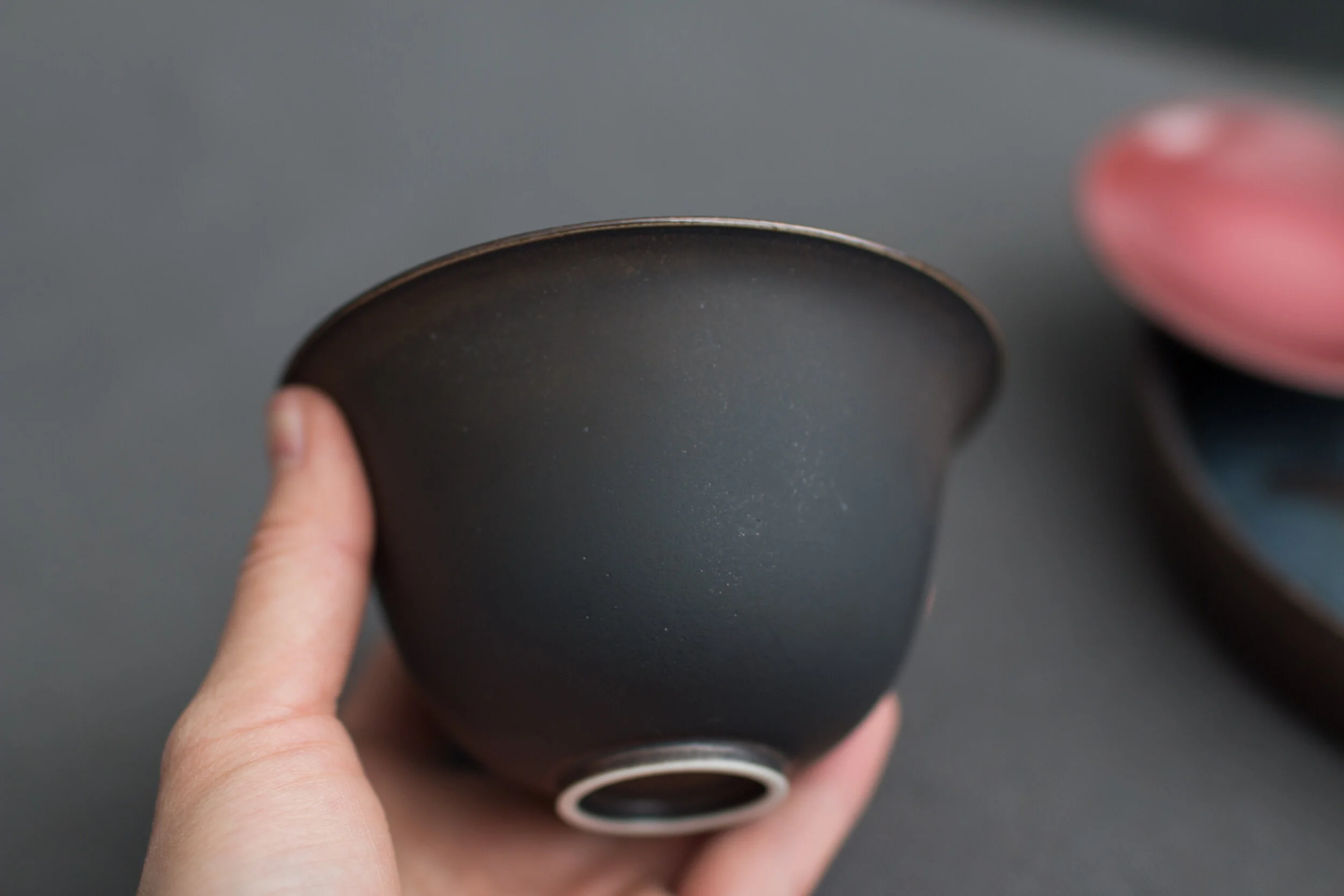 Handmade by “Bian (邊)Studio” in Jingdezhen, China, these gaiwans feature a matte black or dark brown glaze. The interior of the gaiwan is also glazed with a dark red color. They both feature a Bian Studio's signature pomegranate lid design. These gaiwans are similar to each other in size and dimension, but each one is wonderfully unique since they are handmade. The design makes them pour like a dream without burning your fingers. We particularly like the neat shape of gaiwans from this studio.